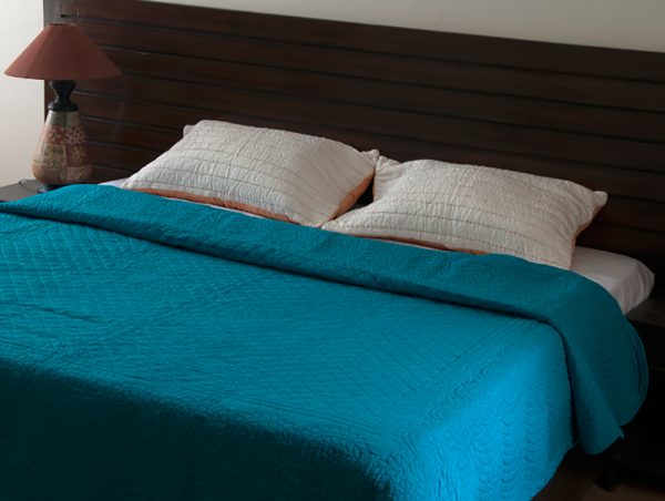 Give extra zing to your bedroom with this turquoise color cotton machine quilt.
