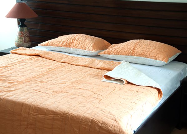 This peach color quilt is a stunning piece features a handmade kantha embroidery for a unique look.