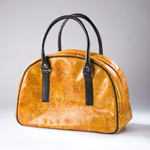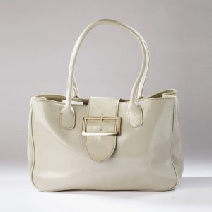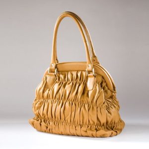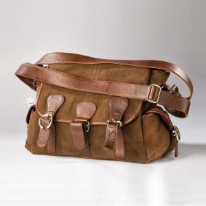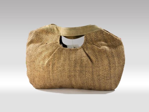 This chic cotton and leather bag features a signature natural color. Two suede-lined side pockets and double top handles add practicality and style to this round satchel bag.