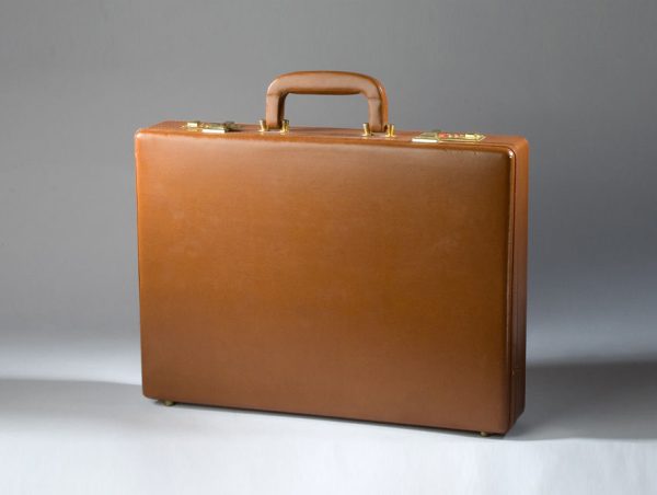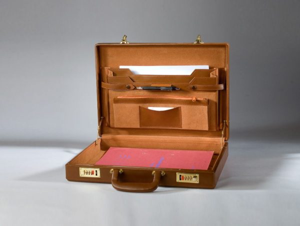 Carry a large laptop, documents and other items using this spacious, well-designed cognac briefcase. This satchel provides ample storage with front and back compartments for your laptop, documents and files and an interior organizer and front pockets for pens, small devices and business cards.